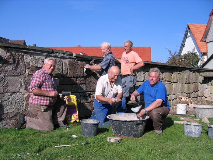 „Rüstigen Rentner“, die hier, gemeinsam mit dem Förderverein der ev. Kirche Balhorn die Balhorner Kirchmauer sanieren.